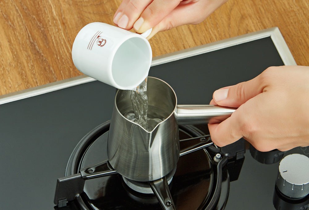Use 5-6 grams (1.5 teaspoons) of coffee per 65ml of water. Add the water into a pot and set it to low heat. Add the coffee and your choice amount of sugar to the water and mix them slowly. Once the coffee comes to a bubble over time, serve the froth into your cup(s). Then boil the remaining coffee some more, and pour the remainder into your cup(s).