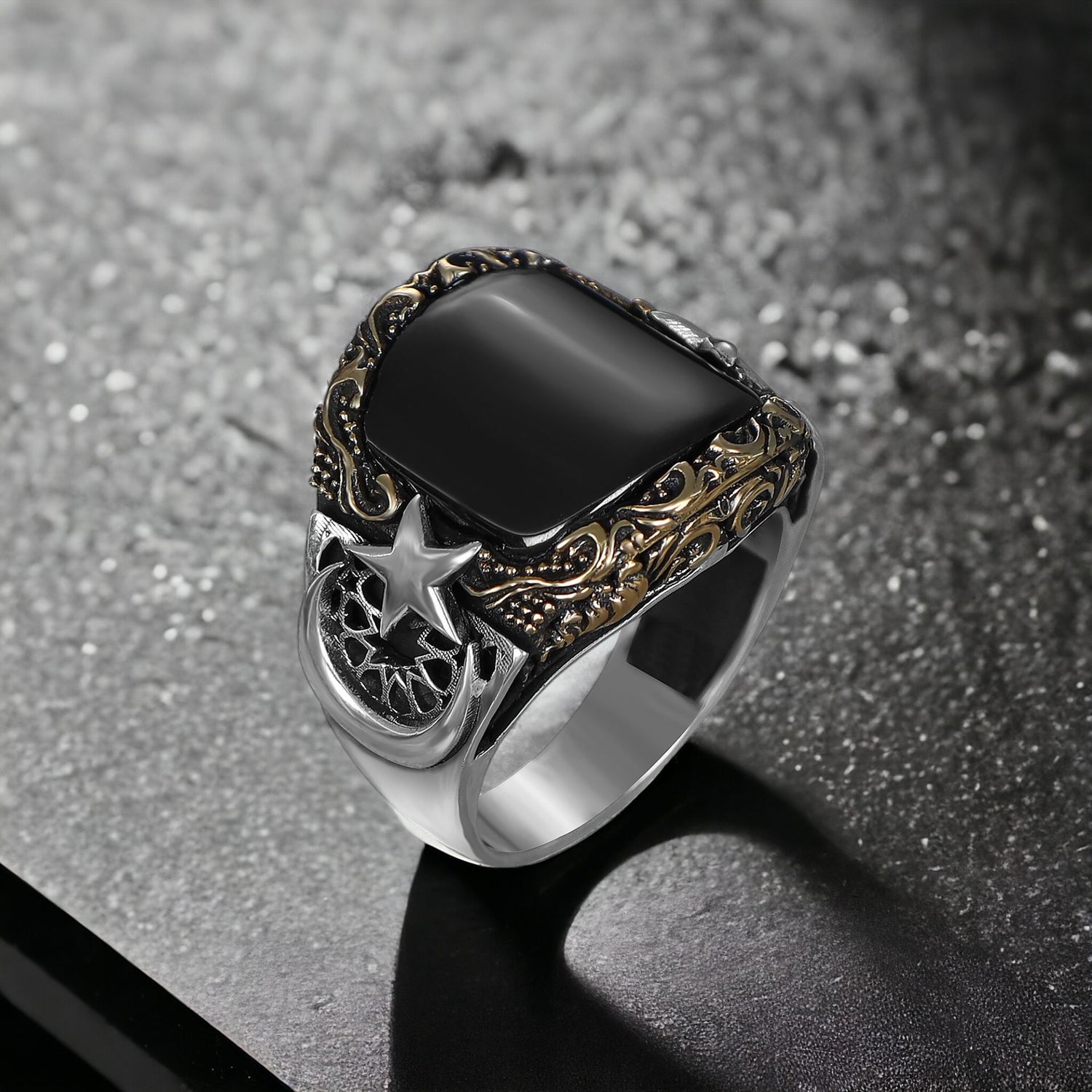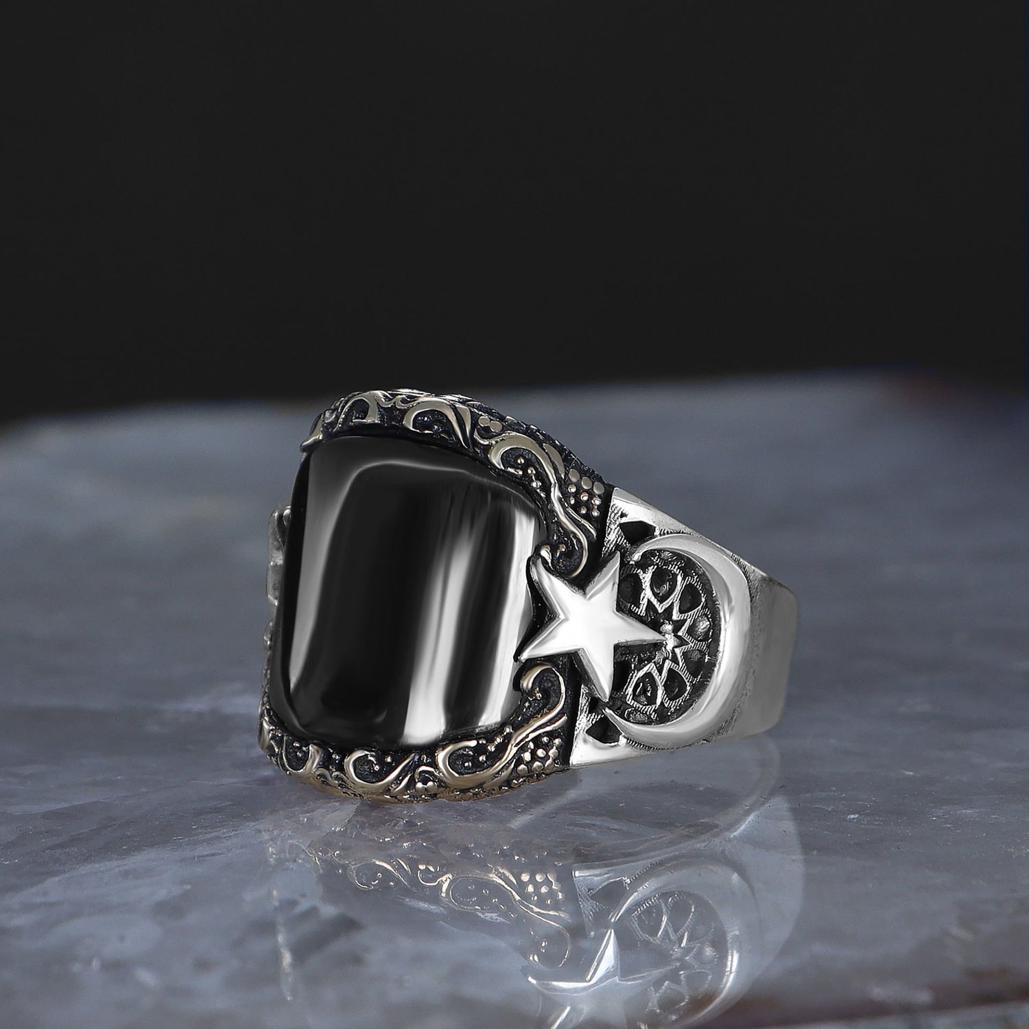 Tesbihevim | Men's Silver Onyx Stone Crescent Model Men's Silver Ring