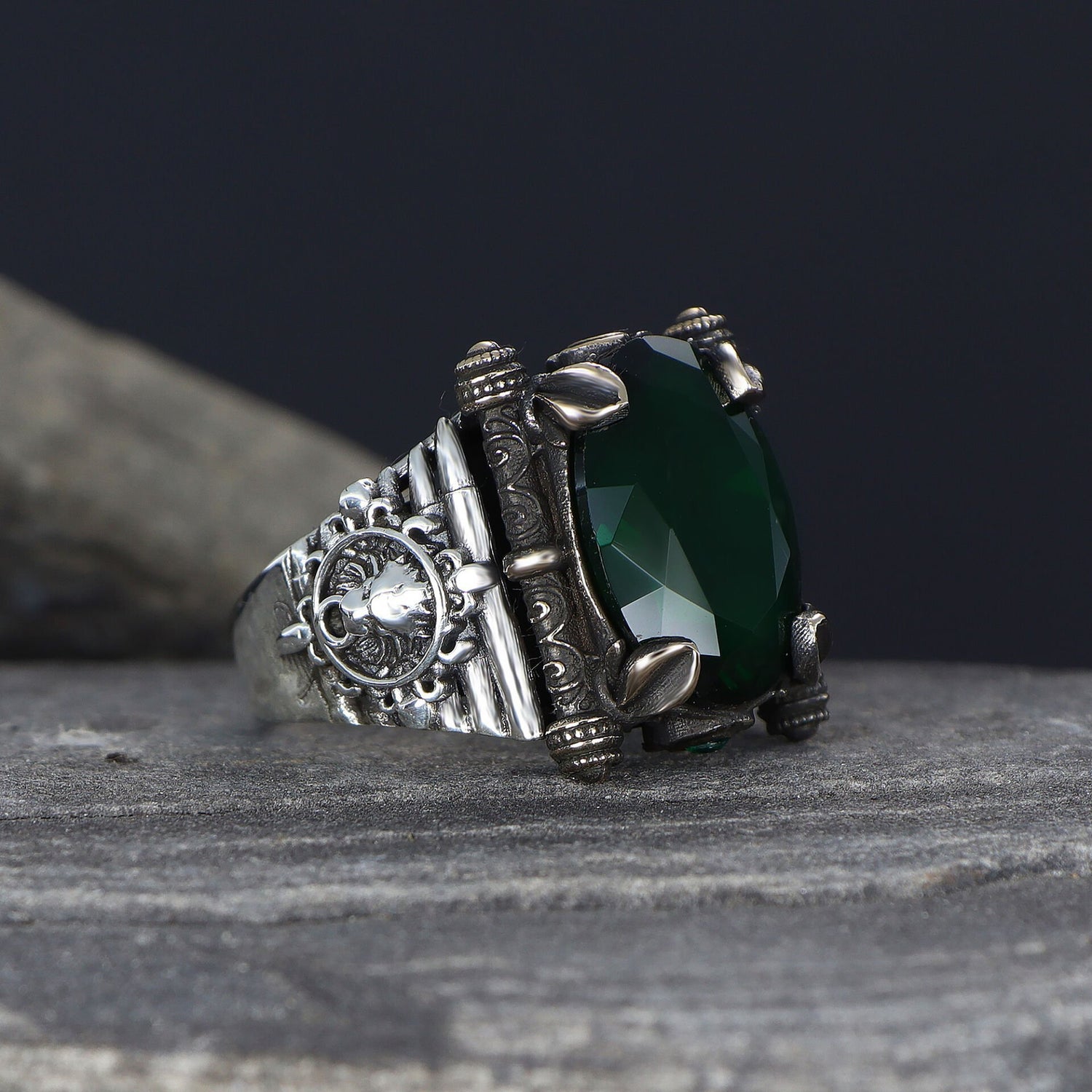 Tesbihevim | Men's Silver Ring with Green Zircon Stone - TryAladdin