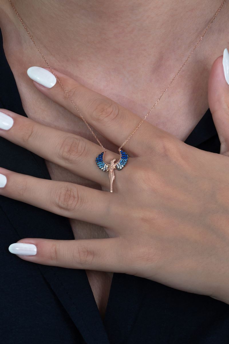 Taki | Hugging Couple Silver Necklace with Blue Stone Michael Angel Wings