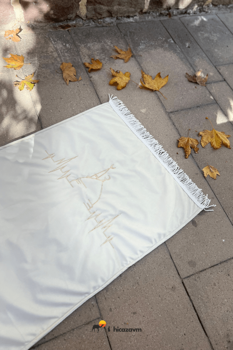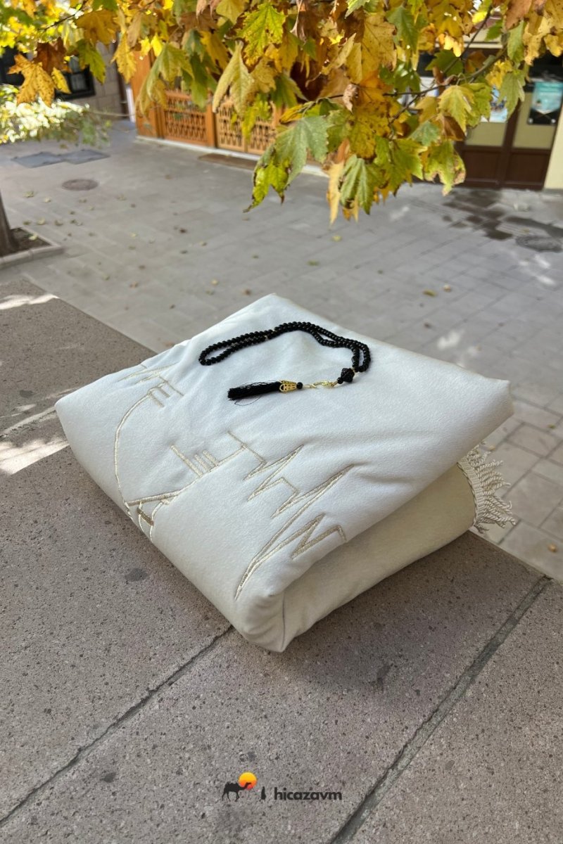 Enrich your prayer experience with this cream-colored prayer rug featuring gold embroidery. Enjoy the luxurious feel and impeccable design of this peaceful and comforting rug.