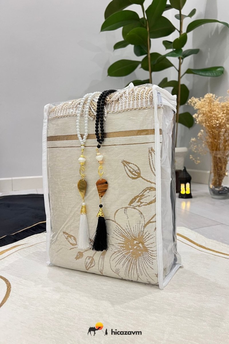 Indulge in the elegance of this heart-themed double prayer rug set, featuring special chenille weaving and a complementary pearl rosary. Perfect as a gift, this set offers durability, style, and spiritual connection in one package.